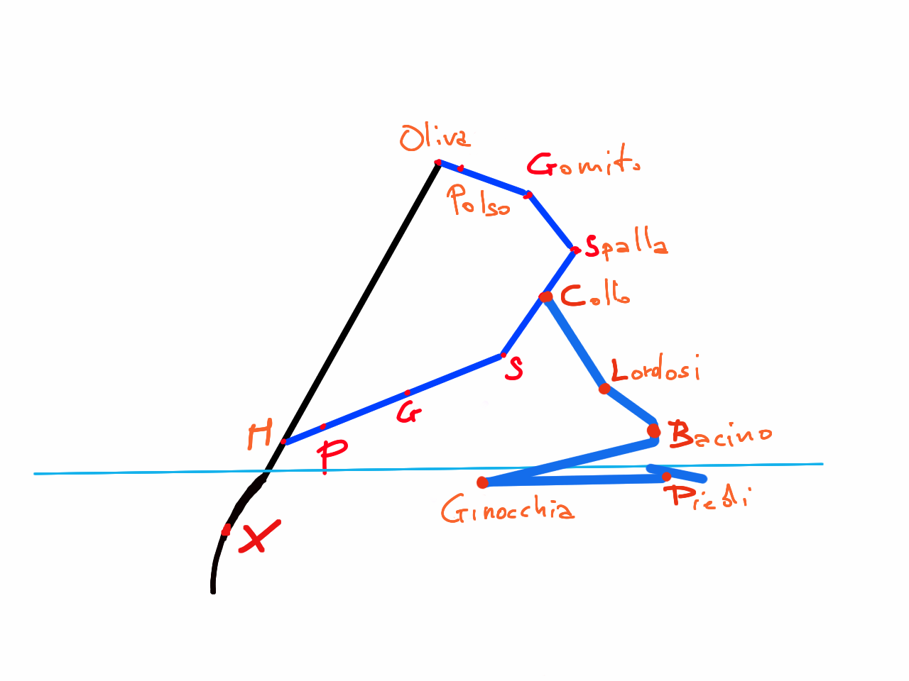 Da notare che i punti di cui sopra, manico-polso-gomito-spalla restano allineati per la maggior parte della passata e che se al posto del braccio ci fosse un pezzo di corda tra il punto spalla ed il punto manico, l'effetto sarebbe identico o, almeno, dovrebbe esserlo.